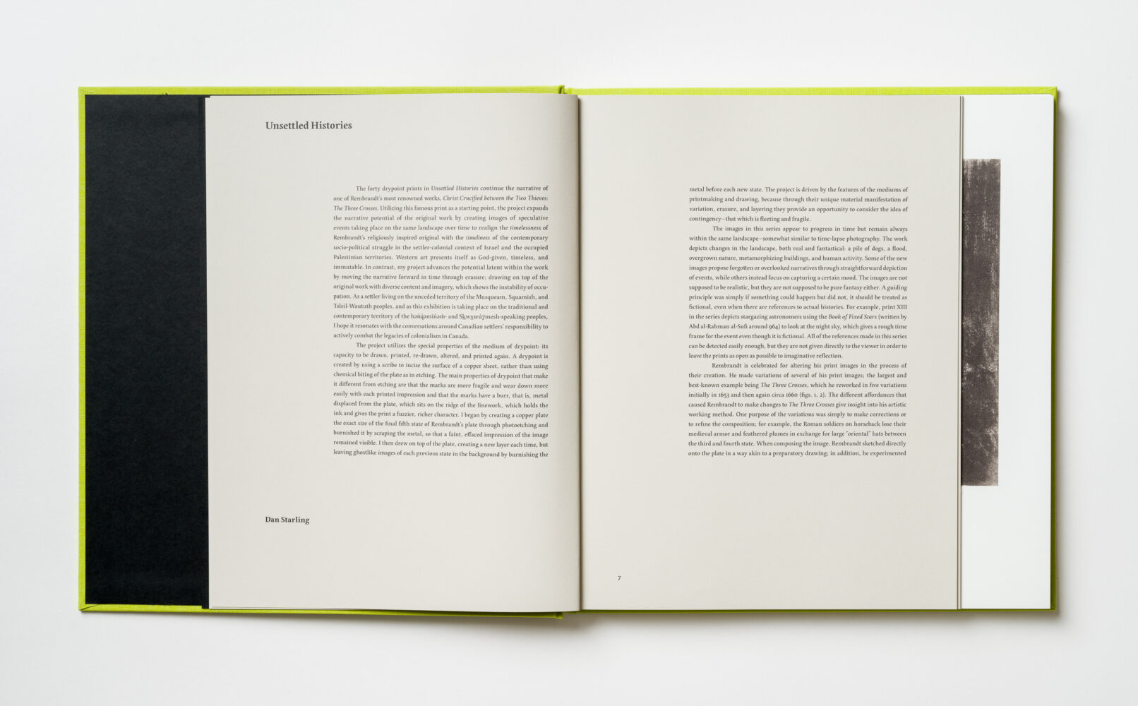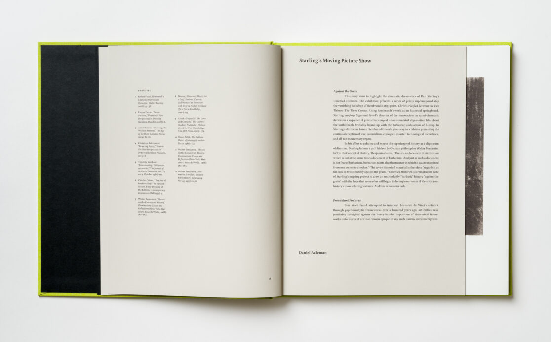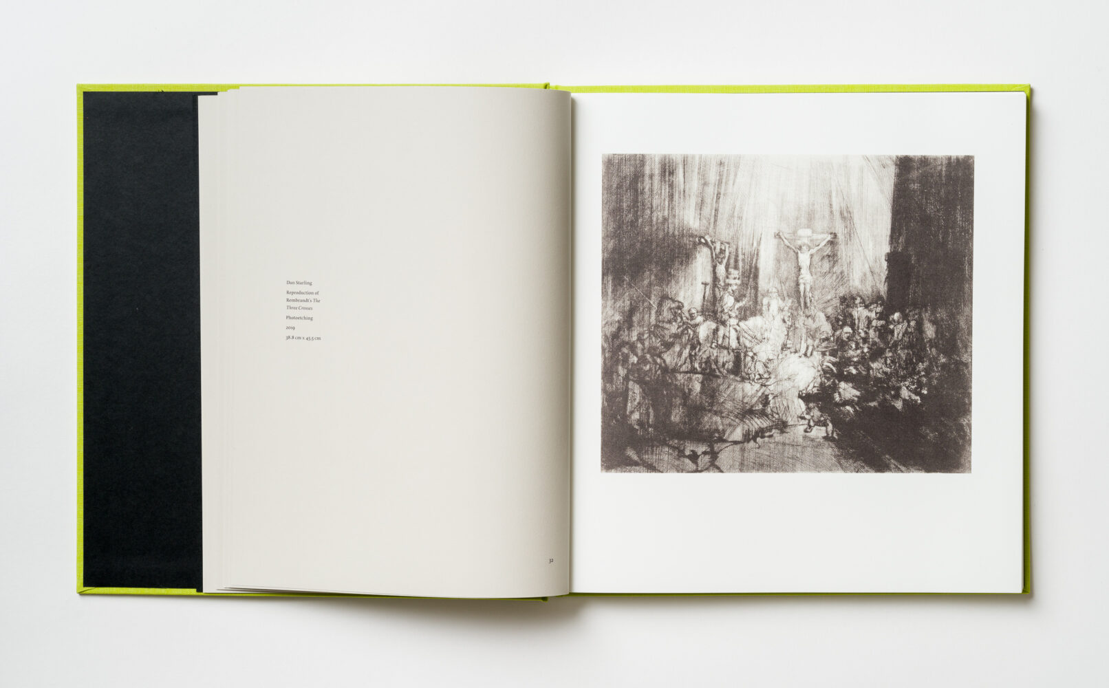 Catalogue accompanying Dan Starlings’s exhibition Unsettled Histories. Taking as his starting point Rembrandt’s renowned etching, Christ Crucified Between Two Thieves, Starling created 40 drypoint prints, using just one piece of copper, drawn upon and rubbed flat each time, printed again and again, embellishing the shadows of the erased images to create unstable tableaus. Creating a shifting narrative and unsettling the history outside the walls of Jerusalem, Starling imagined 40 different possibilities history may have taken. The cover references Starling’s single copper plate which he used to portray a multitude of propositions, fictions, literary accounts, and imaginings.
