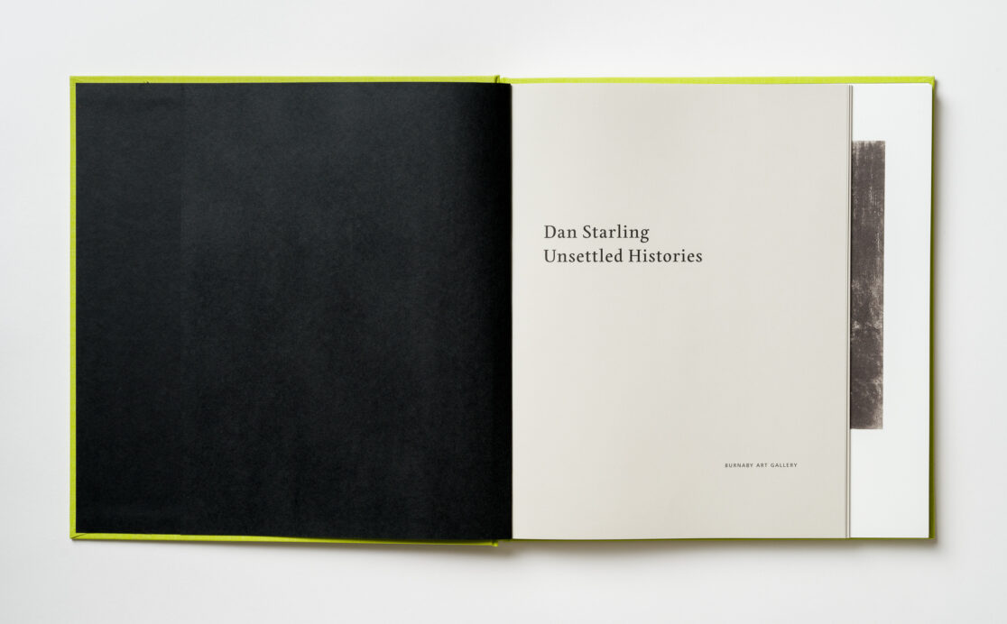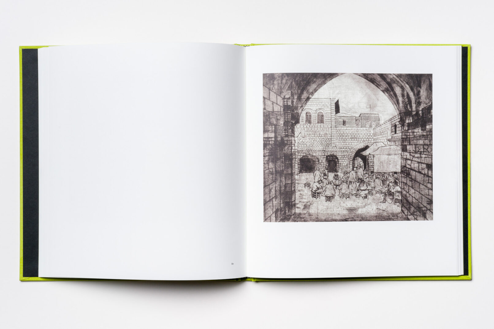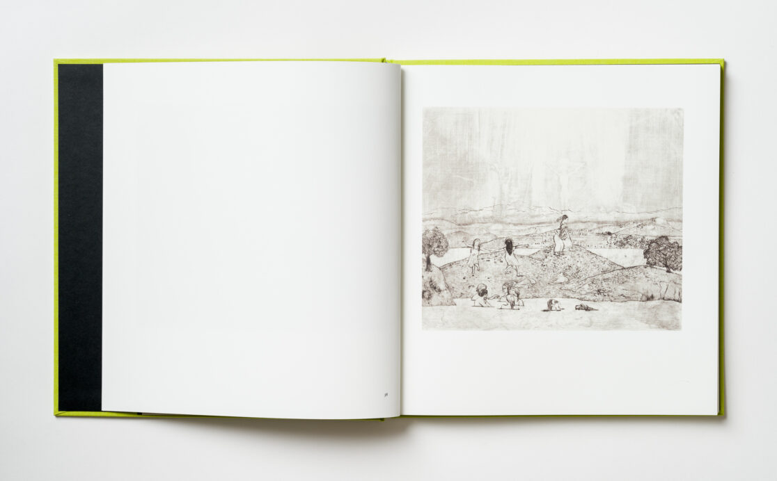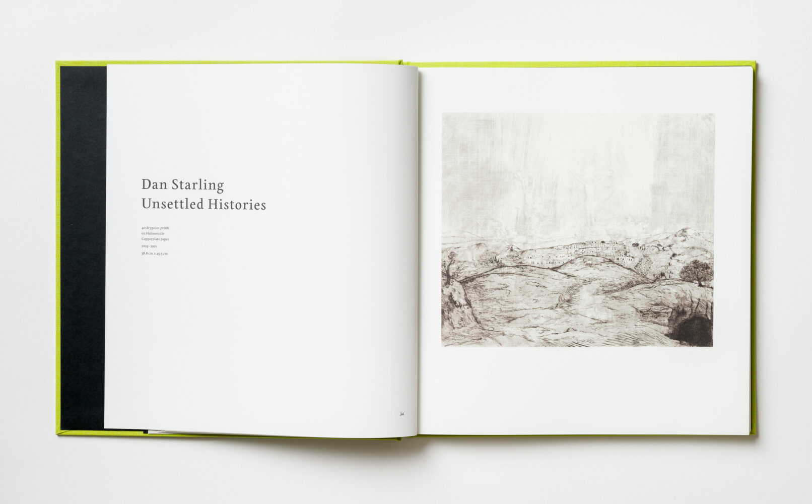 Catalogue accompanying Dan Starlings’s exhibition Unsettled Histories. Taking as his starting point Rembrandt’s renowned etching, Christ Crucified Between Two Thieves, Starling created 40 drypoint prints, using just one piece of copper, drawn upon and rubbed flat each time, printed again and again, embellishing the shadows of the erased images to create unstable tableaus. Creating a shifting narrative and unsettling the history outside the walls of Jerusalem, Starling imagined 40 different possibilities history may have taken. The cover references Starling’s single copper plate which he used to portray a multitude of propositions, fictions, literary accounts, and imaginings.