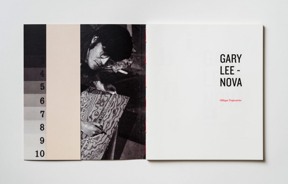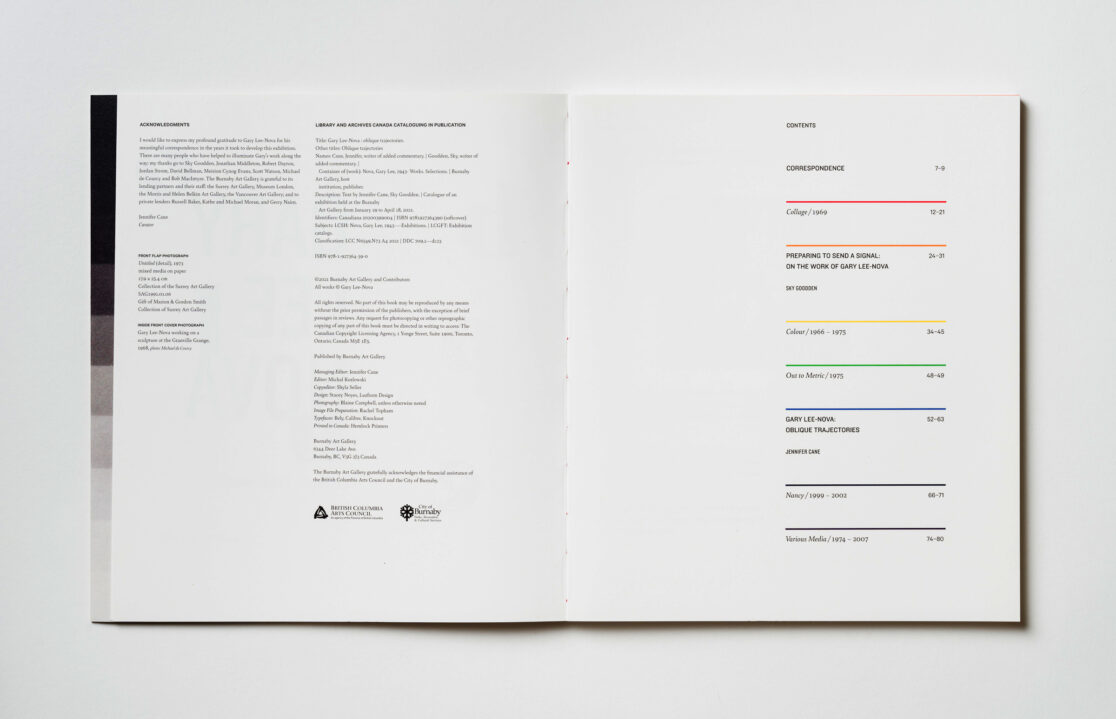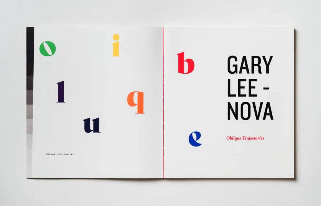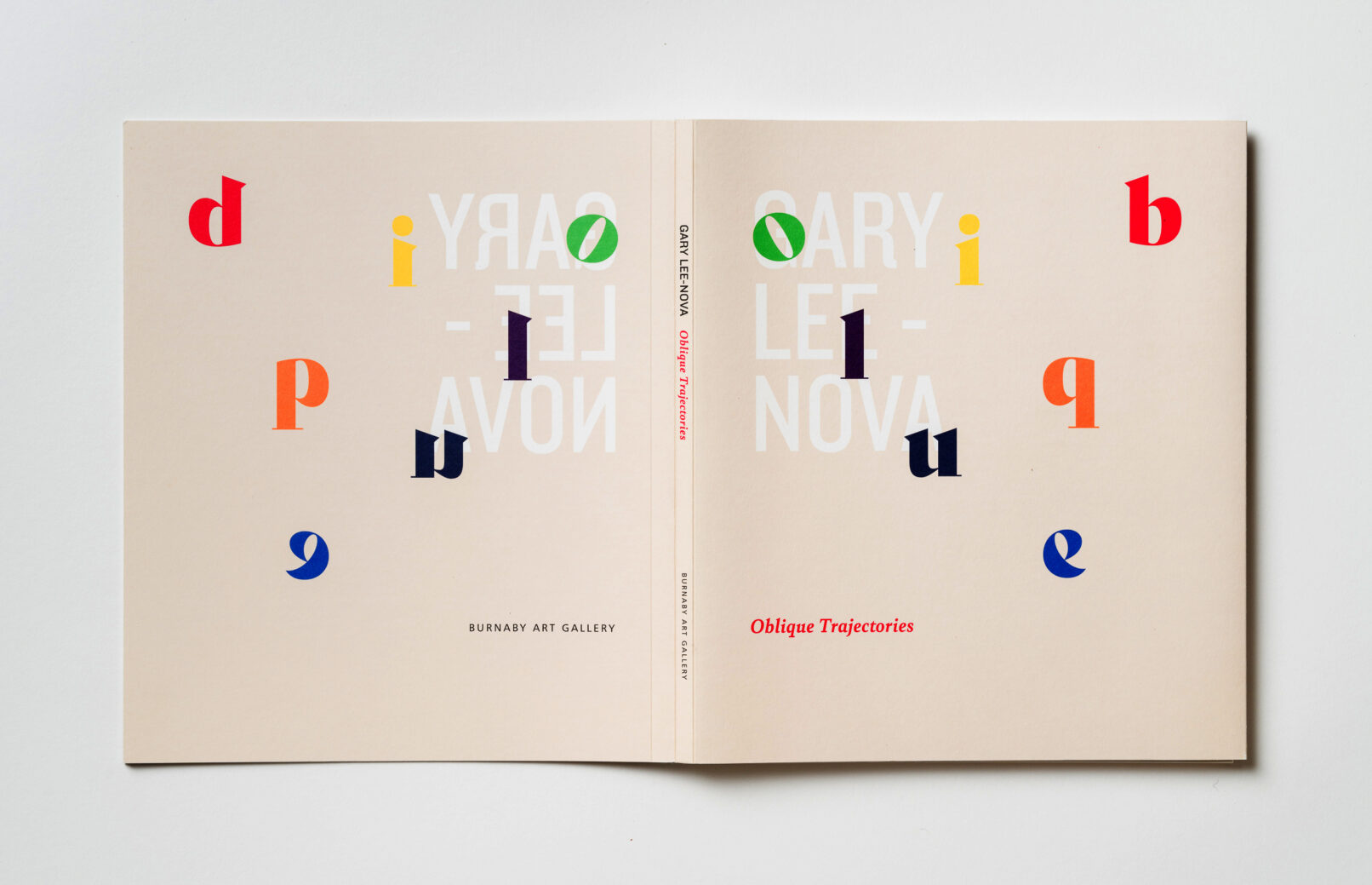 Catalogue accompanying Gary Lee-Nova’s exhibition Oblique Trajectories, a survey of Lee-Nova’s decades long career and vast research on language, measurement and systems of colour. Echoing Lee-Nova’s artwork, colour is used to signal organization and separation, including red thread for the exposed spine. I am most proud of receiving an email from Stan Bevington, the legendary founder and original publisher of The Coach House Press.