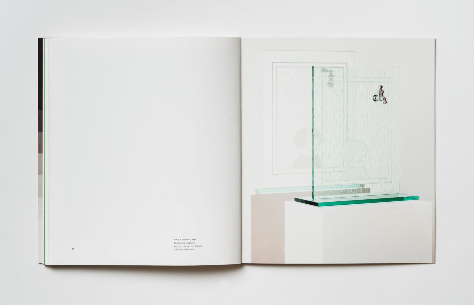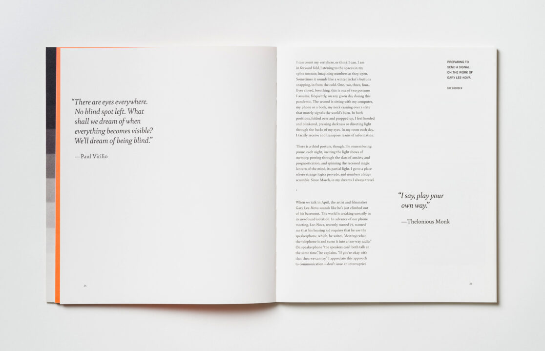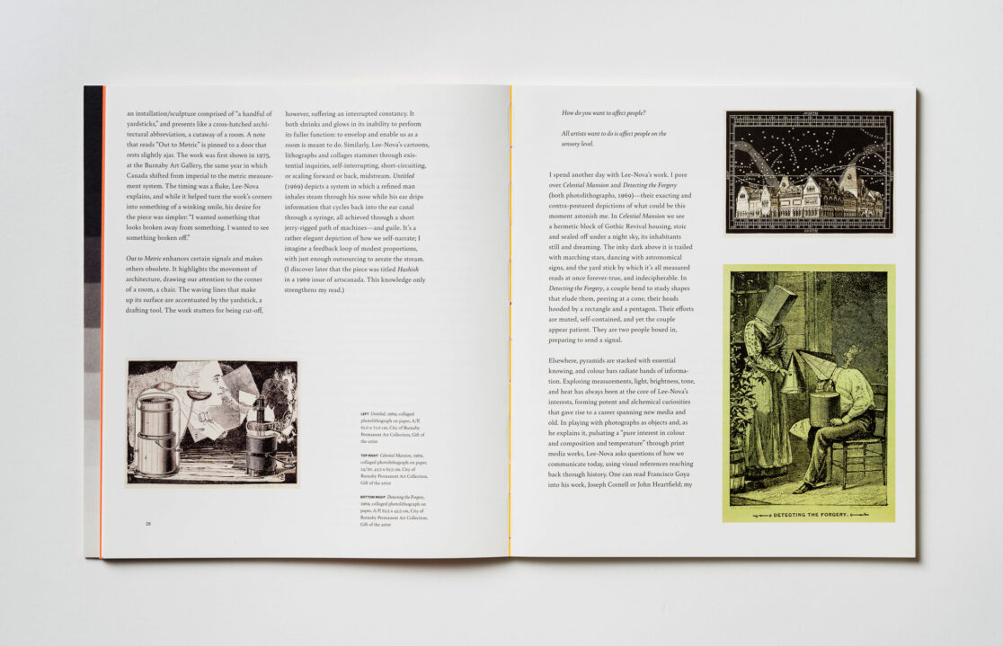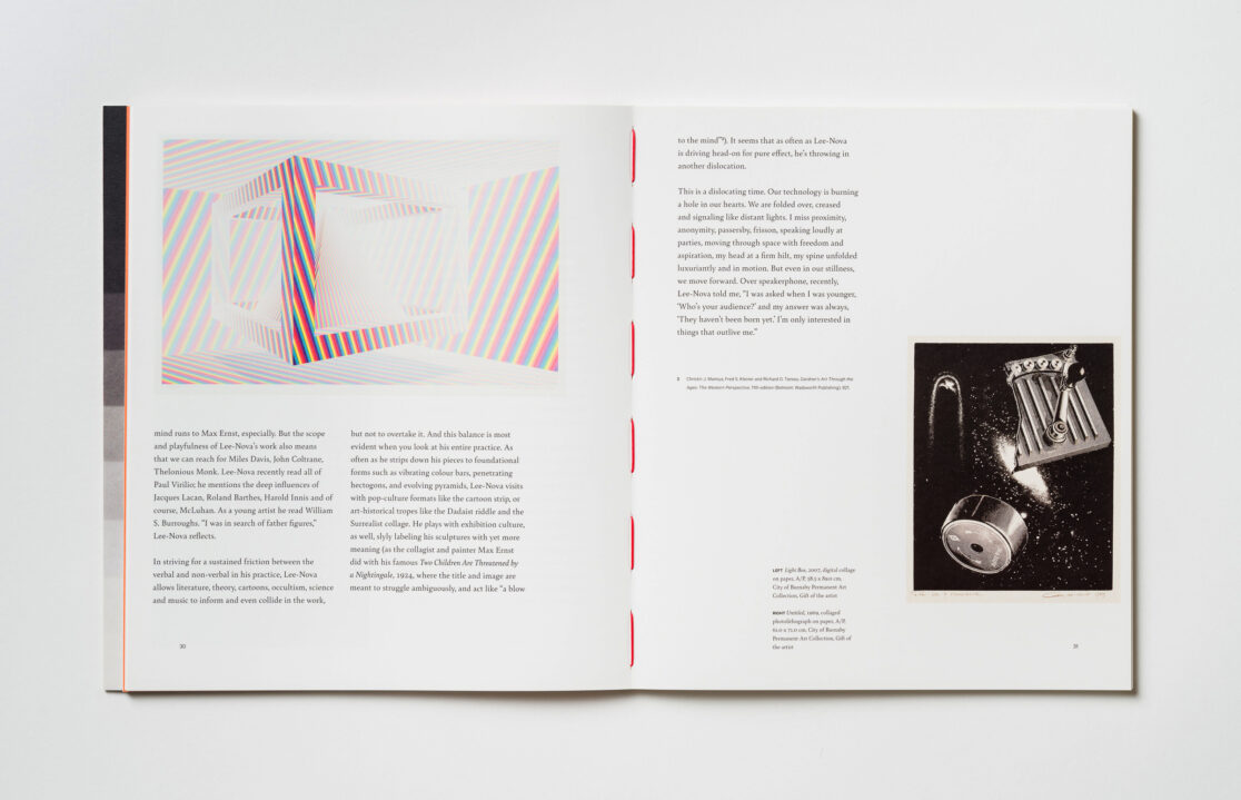 Catalogue accompanying Gary Lee-Nova’s exhibition Oblique Trajectories, a survey of Lee-Nova’s decades long career and vast research on language, measurement and systems of colour. Echoing Lee-Nova’s artwork, colour is used to signal organization and separation, including red thread for the exposed spine. I am most proud of receiving an email from Stan Bevington, the legendary founder and original publisher of The Coach House Press.