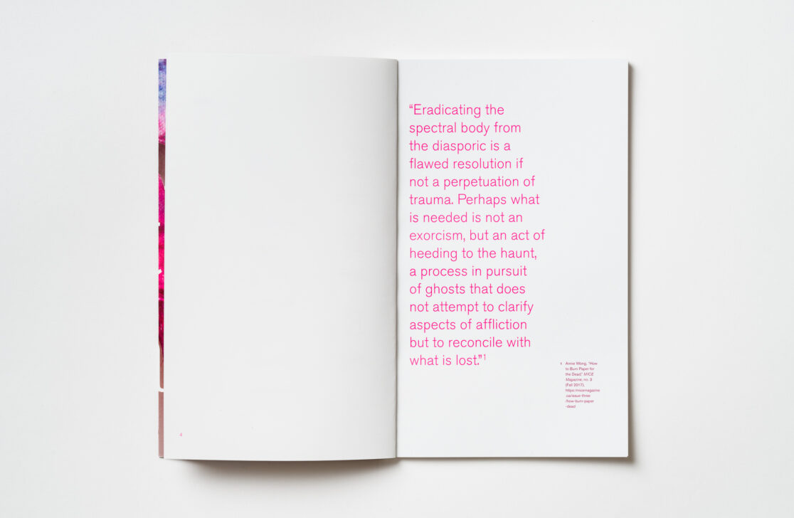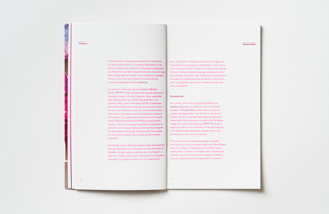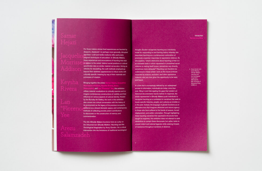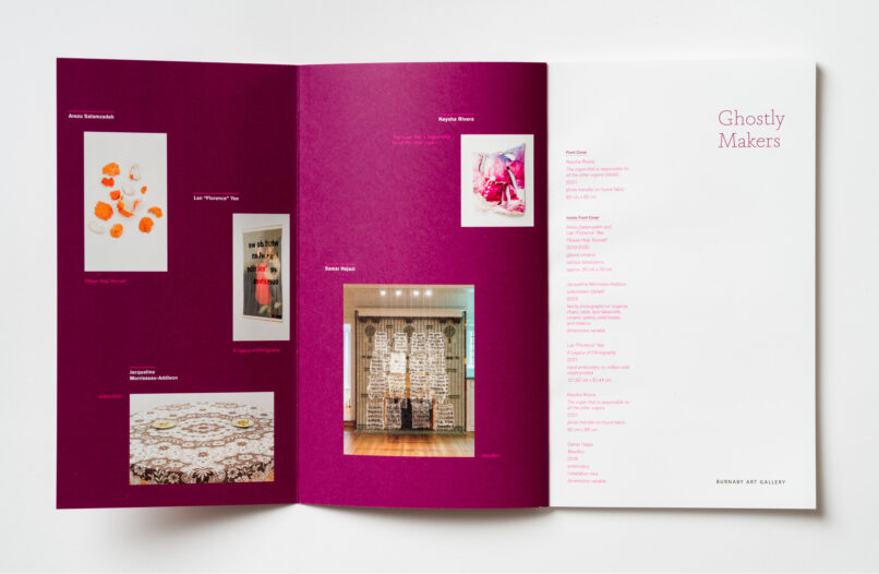 Designing the catalogue as a glossary for the artists Samar Hejazi, Jacqueline Morriseau-Addison, Keysha Rivera, Arezu Salamzadeh and Lan “Florence” Yee to highlight the materiality of their practices, the exhibition Ghostly Makers critically examines and re-imagines contemporary constructions of visibility and their influence on various aspects of cultural identity.
