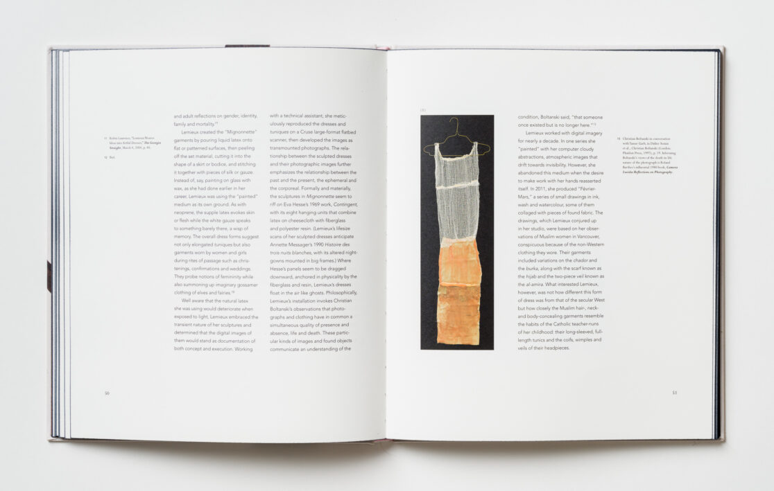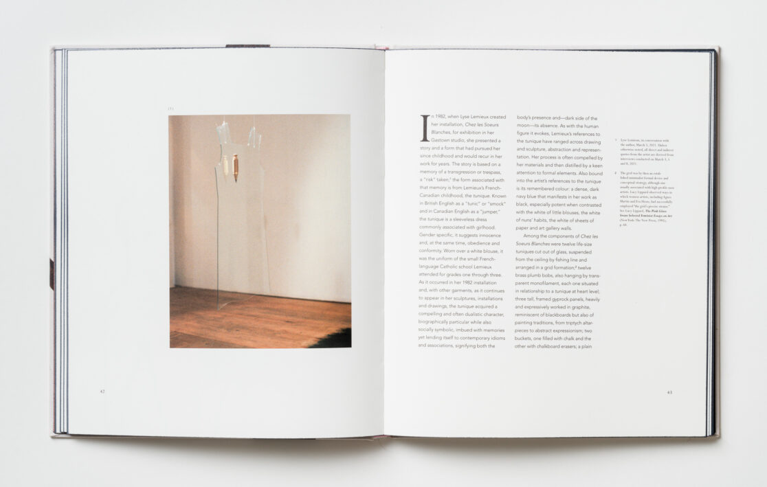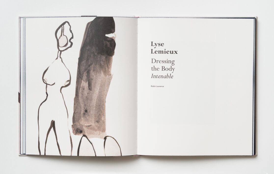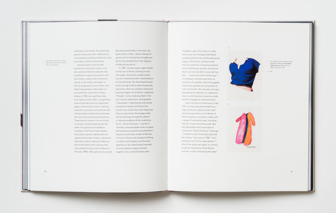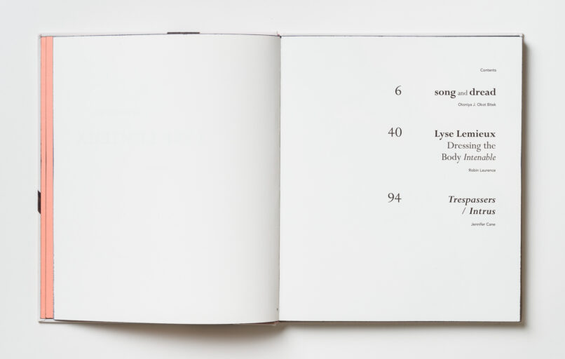 Catalogue accompanying Lyse Lemieux’s exhibition, Trespassers / Intrus, which brought together sculpture and works on paper from a span of over thirty years as Lemieux reconfigured and reconsidered forms and influences, from her Catholic childhood’s French Canadien classroom to the multiple personal, physical and social selves women project, inhabit and experience. An Alcuin winner, the judges noted: “The palette of the cover, the pink headband, the off-white paper stock, and the black fore-edge that helps frame the artwork — all help to brilliantly reinforce the aesthetic essence of the featured artworks while also allowing that work to speak for itself.”