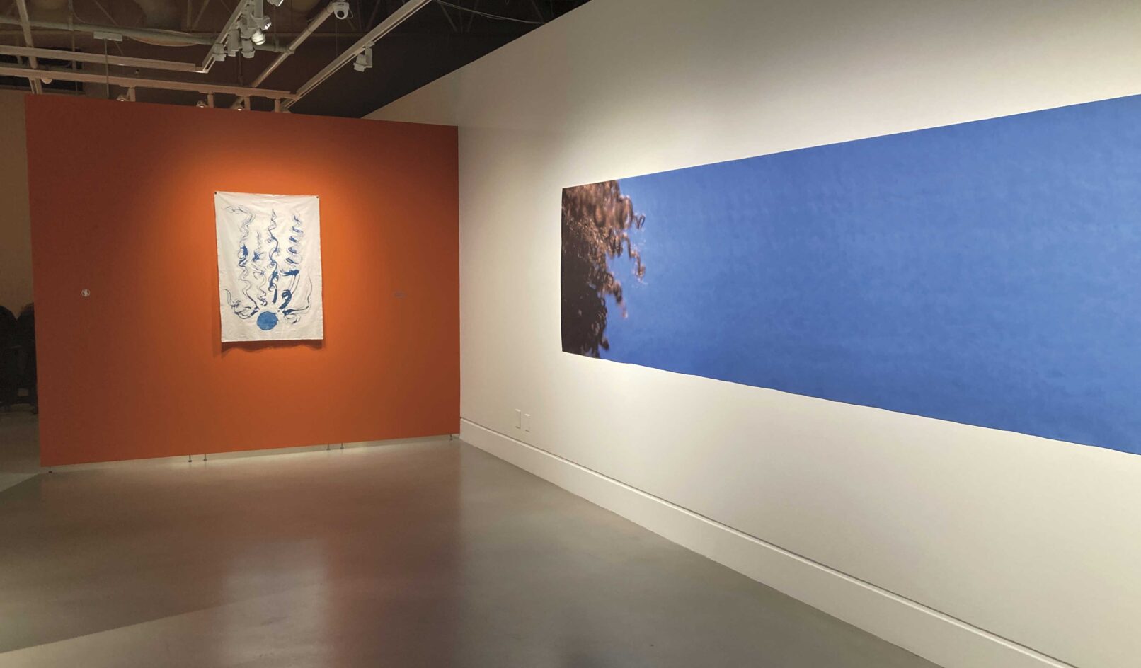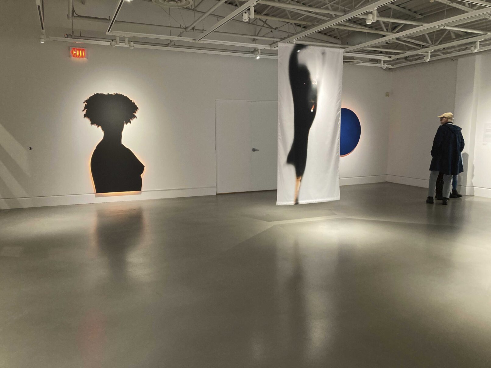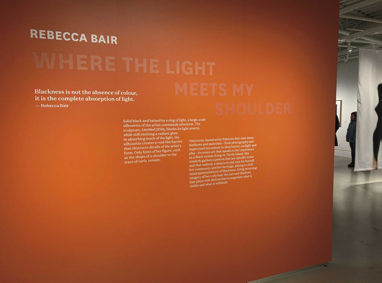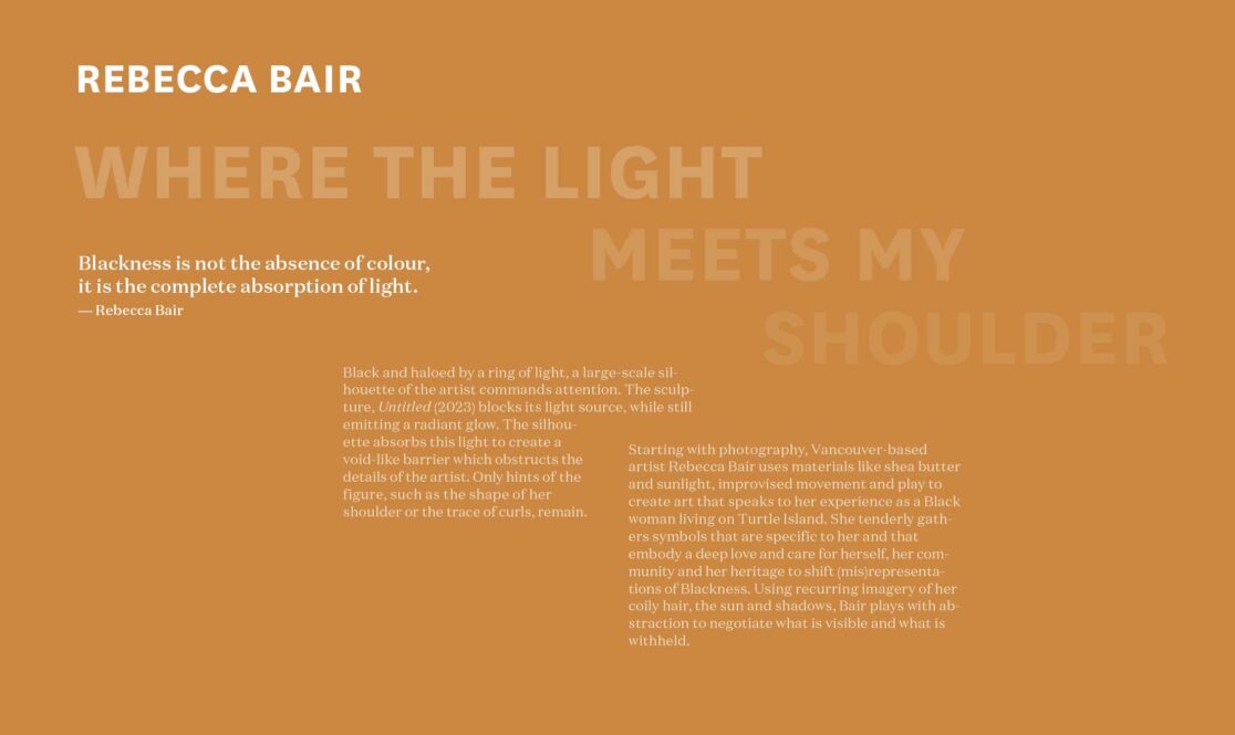 Working with the curator Katherine Dennis and artist Rebecca Bair for Where the Light Meets My Shoulder, we explored ideas about the tension between obstruction and legibility. Although all the type of the signage design is legible, the decreasing opacity of the title type, shows the absorption of light into the background colour of the orange wall, as a contrast to the artwork of the halo of orange light emanating from behind Bair’s silhouette in the show.