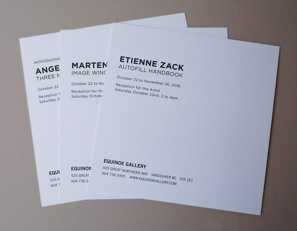 With no images available, the challenge was to use typography to both refer to and play off the artworks of Etienne Zack, Marten Elder & Angela Teng for their exhibitions at Equinox Gallery.